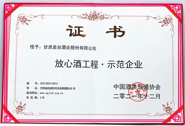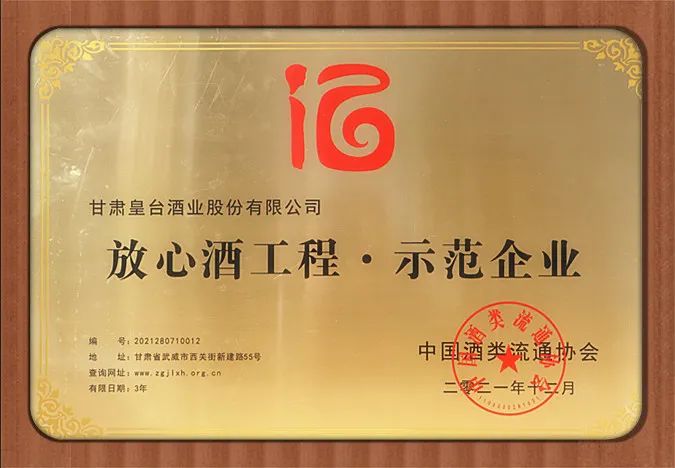 質(zhì)量是一個(gè)企業(yè)的生命線,“以質(zhì)量求生存,”是皇臺(tái)酒業(yè)至始至終的發(fā)展理念?;逝_(tái)曾連續(xù)多年榮獲甘肅省名牌產(chǎn)品稱號(hào),被中國(guó)質(zhì)量萬(wàn)里行市場(chǎng)調(diào)查中心授予“國(guó)家監(jiān)督檢查產(chǎn)品質(zhì)量知名品牌”,被中國(guó)質(zhì)量檢驗(yàn)協(xié)會(huì)授予“全國(guó)質(zhì)量檢驗(yàn)合格穩(wěn)定產(chǎn)品”稱號(hào)。公司為確保產(chǎn)品質(zhì)量安全為首要任務(wù),實(shí)施各層級(jí)、各崗位嚴(yán)格管理,建立并完善全員、全過(guò)程、全方位的質(zhì)量管理體系。始終把誠(chéng)信作為企業(yè)立足的基石,實(shí)實(shí)在在釀糧食酒、放心酒、安全酒。 此次,皇臺(tái)酒業(yè)被中國(guó)酒類流通協(xié)會(huì)授予“放心酒工程·示范企業(yè)”等榮譽(yù),不僅證明了皇臺(tái)酒業(yè)產(chǎn)品的優(yōu)質(zhì),體現(xiàn)了行業(yè)及消費(fèi)者對(duì)企業(yè)的認(rèn)可和支持,而且也彰顯了皇臺(tái)酒業(yè)不忘初心,主動(dòng)作為,勇于擔(dān)當(dāng)?shù)纳鐣?huì)責(zé)任心。