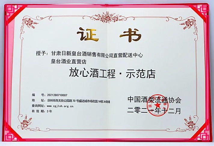皇臺(tái)酒業(yè)直營(yíng)店被中國(guó)酒類流通協(xié)會(huì)授予