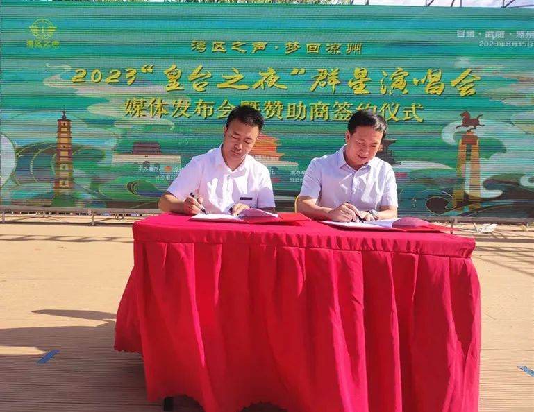 皇臺酒業(yè)總經(jīng)理代繼陳、涼州區(qū)文化傳媒有限責(zé)任公司黨支部書記劉興明共同簽署贊助合約