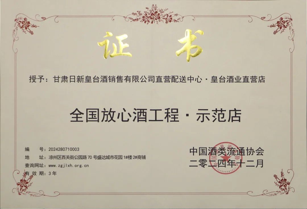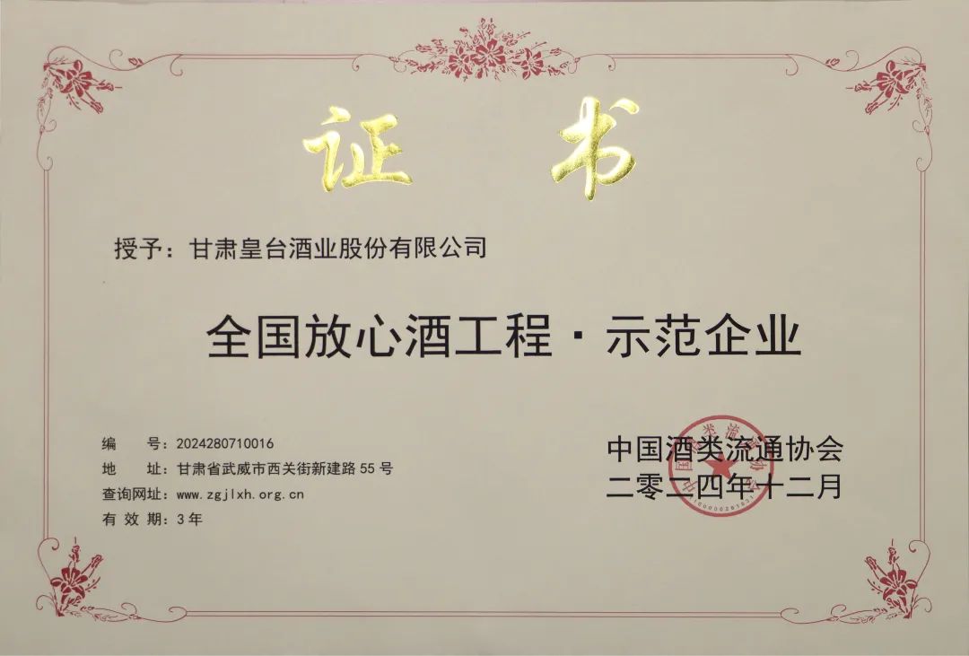 12月中旬,2024年中國酒類流通協(xié)會公布了全國放心酒工程示范企業(yè)(店)名單,甘肅皇臺酒業(yè)股份有限公司憑借優(yōu)異的品質(zhì)和信譽(yù),成功榮獲了全國放心酒工程·示范企業(yè)殊榮。與此同時,甘肅日新皇臺酒銷售有限公司直營配送中心也因其優(yōu)質(zhì)的服務(wù)和管理,榮獲了全國放心酒工程·示范店稱號。