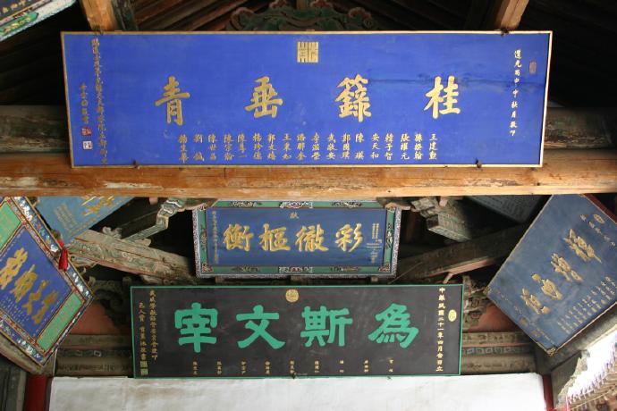 四十四塊牌匾中,除以上所述之外:“化峻天樞”,題于康熙五十八年;“德盛化神”匾,題于雍正九年;“司文章命”匾,特簡(jiǎn)文林郎知武威縣事王守曾題于乾隆四年;“掌仙桂籍”匾,鄭松齡題于乾隆四年;“陽春一曲”,于雍正元年題寫;“文明長(zhǎng)晝”,曾國(guó)瑛于乾隆十一年題寫;“聚精揚(yáng)紀(jì)”,于嘉慶十一年,甘肅按察使司按察使、前分守甘涼兵備道劉大懿題寫;“云漢天章”,張美如題寫于道光年間;“天下文明”,牛鑒題寫于道光十九年;“文以載道”,王步瀛題寫于宣統(tǒng)建元己酉秋;“文明以正”,民國(guó)六年題寫……“斯文主宰”,為文昌宮山門橫批;“月滕殿輝”,為桂籍殿門前牌樓橫批。其中“書城不夜”和“聚精揚(yáng)紀(jì)”兩塊牌匾,被收錄進(jìn)中華名匾。